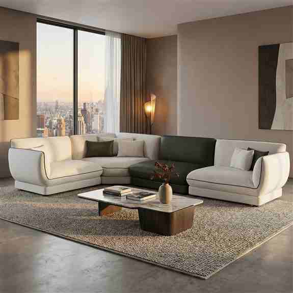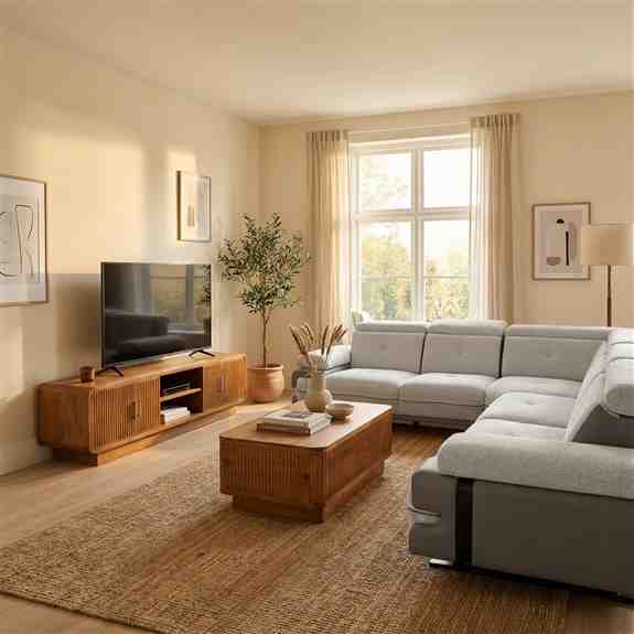 Présentation de nouvelles collections contemporaines, incluant des meubles en bois massif, des solutions modulaires et des ensembles complets pour le salon, la salle à manger et la chambre à coucher.